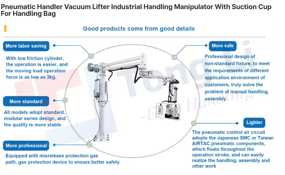 The industry manipulator is a set of assisted handling equipment designed based on dynamics and ergonomics, and its operation mode is through manual button operation, by the gripping of the fixture tooling to achieve the transfer action of the object.